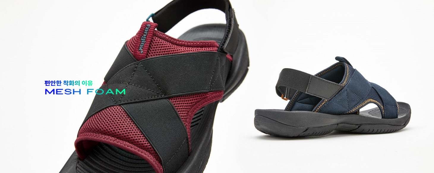 안전하게 고정할 수 있는 벨크로, 발에 밀착되지 않는 샌들은 발뒤꿈치와 앞부분이 외부에 노출되어 있어 장시간 착화할 때나, 움직임이 많은 활동을 할 때 불편하곤 합니다. 그래서 발꿈치부에 러버밴드와 벨크로를 적용하여 착화 시 발에 맞게 조절할 수 있도록 하였습니다.무게가 가볍고 쿠션감이 좋은 파이론 미드솔과 접지력 향상을 돕는 러버 아웃솔을 적용하였습니다. 보다 편안하고 안정감 있는 착용감을 느낄 수 있습니다.