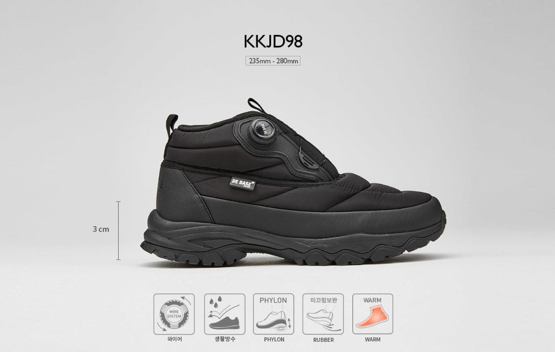 기모 원단 인솔로 확실한 보온력, KKJD98은 푹신한 패딩폼이 적용된 가벼운 방한화입니다. 찬바람에 가장 많이 노출되는 발등 부분을 감싸주는 방한 원단에 따뜻한 폼을 적용시켜 겨울철 탁월한 보온력을 느낄 수 있습니다. 발걸음에 방해되지 않으면서 충분히 따뜻함을 줄 수 있는 비율로 패딩폼을 적용하여 포근하고 편안한 착화감을 자랑합니다. 또한 내부 인솔의 기모 원단 적용으로 발끝부터 따뜻하게 감싸주어 발의 온도를 높어줍니다.